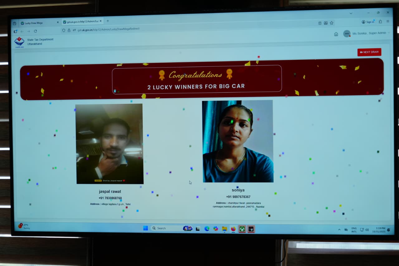 मुख्यमंत्री पुष्कर सिंह धामी ने राज्य स्थापना रजत जयंती समारोह का शुभारंभ करते हुए सचिवालय में ‘बिल लाओ, ईनाम पाओ’ के अंतर्गत मेगा लकी ड्रॉ निकाला। राज्य कर विभाग, उत्तराखण्ड द्वारा आयोजित इस कार्यक्रम में कुल 1,888 लकी ड्रॉ के विजेता चुने गए। इसमें, नैनीताल जनपद की सोनिया और टिहरी जनपद के जसपाल रावत ने प्रथम विजेता के रूप में एक-एक इलेक्ट्रिक कार जीती। मुख्यमंत्री ने दोनों विजेताओं से फोन पर बात कर उन्हें शुभकामनाएं भी दीं।